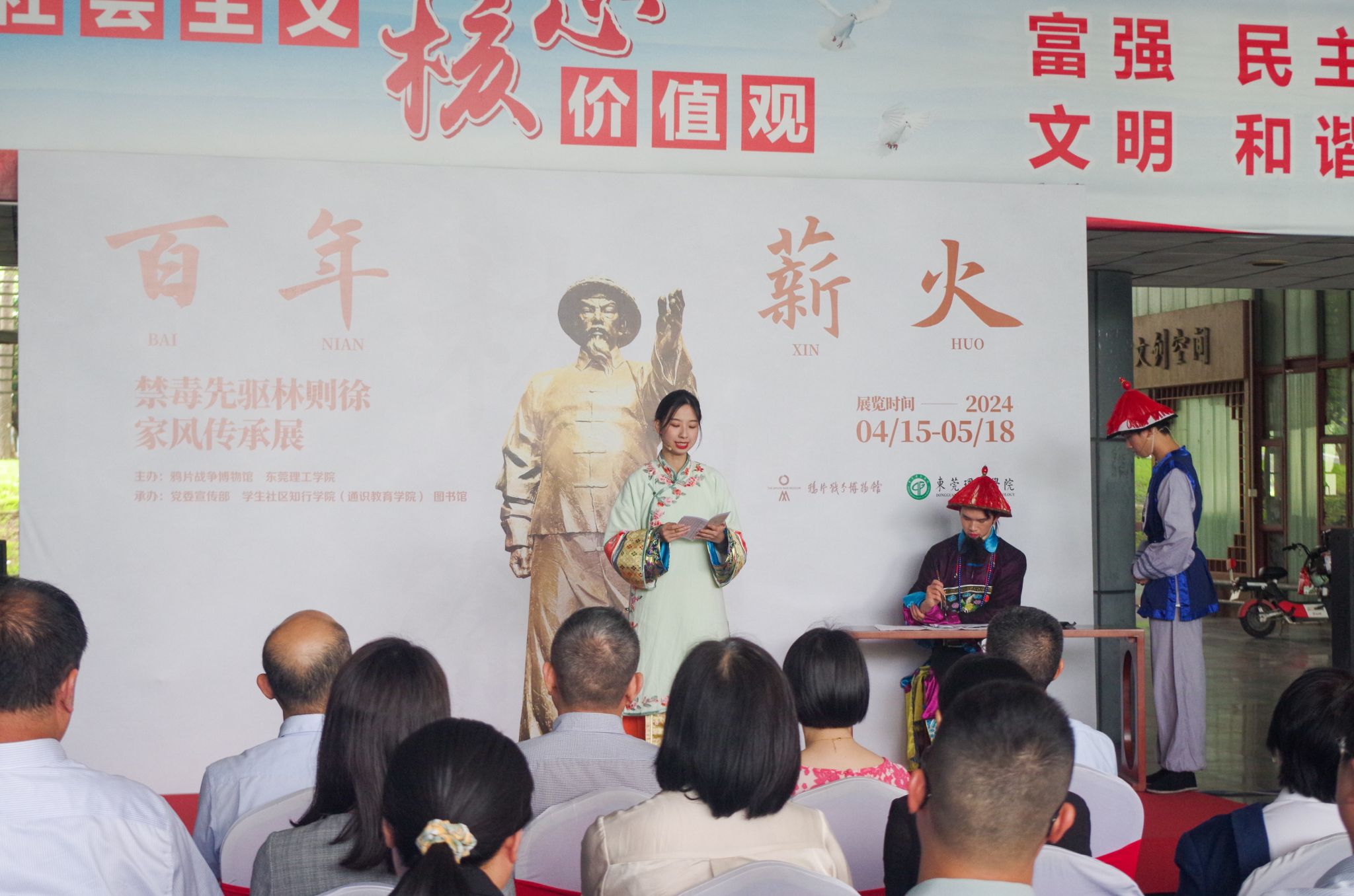 校党委副书记、校长马宏伟,校党委副书记、纪委书记、监察专员赖日辉,鸦片战争博物馆馆长张建雄、副馆长唐立鹏以及学校宣传部、图书馆、学生社区知行学院(通识教育学院)负责人共同为展览揭幕。我校师生代表、鸦片战争博物馆相关负责人,东莞科技创新金融集团和国弘公司党支部参与开幕式,在春日共赴这场文化盛宴。