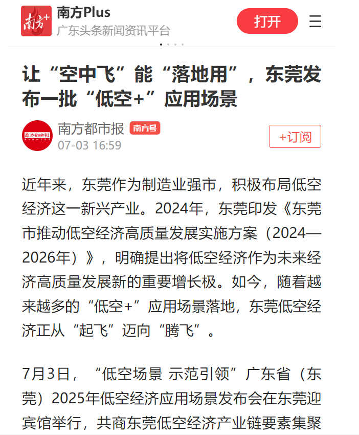 近年来,东莞作为制造业强市,积极布局低空经济这一新兴产业。2024年,东莞印发《东莞市推动低空经济高质量发展实施方案(2024—2026年)》,明确提出将低空经济作为未来经济高质量发展新的重要增长极。如今,随着越来越多的“低空+”应用场景落地,东莞低空经济正从“起飞”迈向“腾飞”。