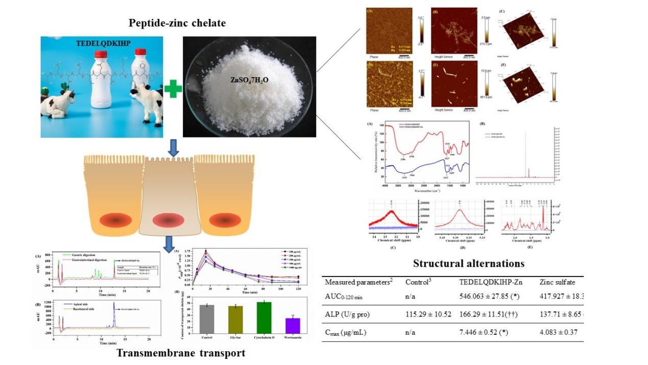 锌,对机体生长发育和免疫系统功能的完善尤其重要,被称为“生命元素”。然而,膳食结构中的植酸、皂苷等抗营养因子会阻碍锌的吸收和利用,导致人体锌缺乏。肽-锌螯合物(peptide-zinc chelate, PZC)由于其特殊的功效,成为促进锌吸收的营养递送体受到广泛关注。PZC是以食源性多肽为结构基础构建的复合物,它能够避免锌离子在消化道内沉淀,同时还能减少锌离子吸收过程中其他营养元素的竞争性抑制作用。目前,PZC在营养学领域的应用仍然存在一个巨大的挑战亟待解决,即不同来源、不同氨基酸序列多肽构建的PZC促锌吸收效果的稳定性差异巨大,并且调控困难,严重限制了其在营养学领域的深度开发和应用。
