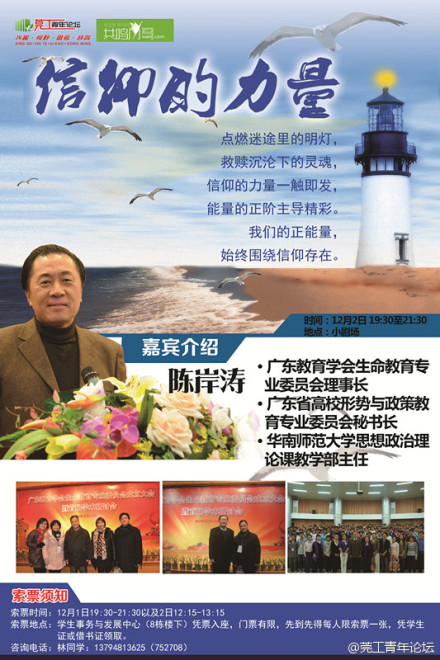 《信仰的力量》点燃迷途里的明灯,救赎沉沦下的灵魂,信仰的力量一触即发,能量的正阶主导精彩。我们的正能量,始终围绕信仰存在。 # 2013年12月2 号晚7:30,松山湖校区小剧场 #