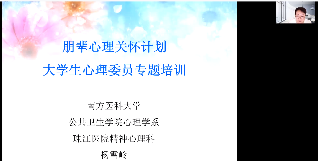 为进一步贯彻落实“五育并举”、“三全育人”工作理念,发挥朋辈互助效能,提升心理育人实效。党委学研工部、学生处心理健康教育与咨询中心于3月31日邀请南方医科大学心理学系杨雪岭副教授开展了“疫情时代的朋辈心理关怀”专题培训,全校近800名学生朋辈参加。