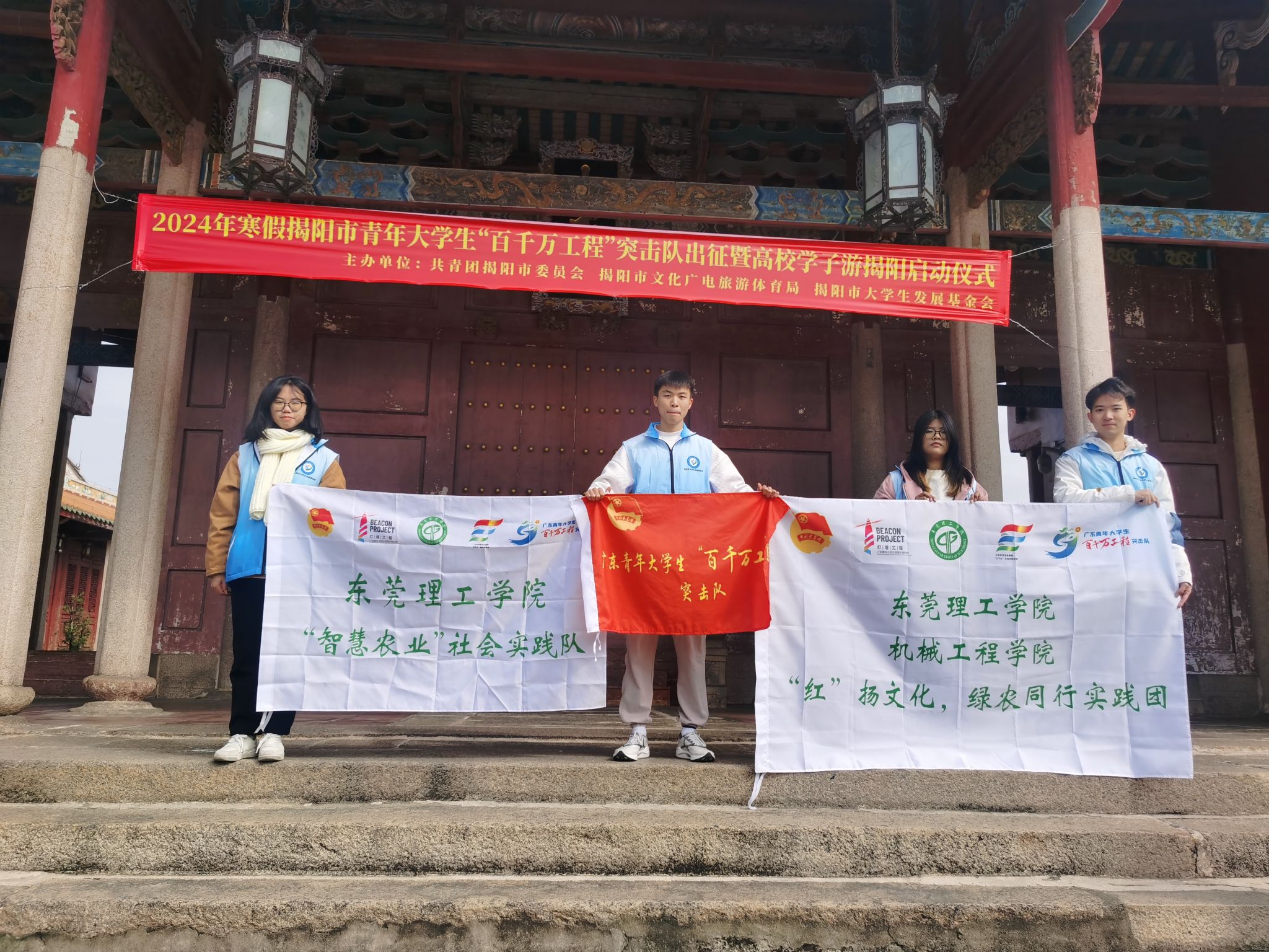 1月23—24日,机械工程学院组织青年大学生“百千万”突击队赴普宁市船埔镇深入开展调研和寒假社会实践。1月25日,在揭阳市举行的2024年寒假揭阳市青年大学生“百千万工程”突击队出征暨高校学子游揭阳启动仪式上,机械工程学院“智慧农业社会实践队”与“‘红’扬文化,绿农先行实践队”两支实践队代表在本次青年大学生“百千万工程”突击队授旗仪式中上台接旗。