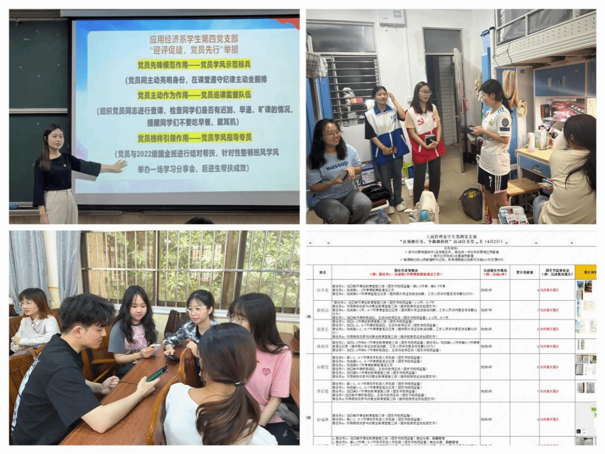在学风建设方面,工商管理系学生第四党支部组织开展“认领微任务,争做微榜样”系列活动,通过党员认领“微任务”的方式带动身边的同学共同打造积极向上、自律自强的优良学风,并组织制作了学风建设宣传标语,为良好课堂环境的塑造添砖加瓦;应用经济系学生第二党支部聚焦社区学风建设关键点,连接“课堂”和“宿舍”两大场域,开展“党员领航,共创优良学风舍风”系列活动,在“教室督察”和”优秀学风舍风宣传”两大工作模块做出了特色。