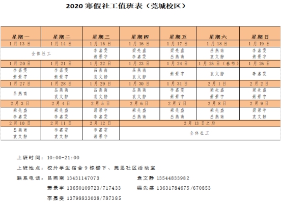 据悉,在会议开始前,7个分院分别开展“辞旧迎新”社区除尘暨春节布置工作,营造温暖的社区环境。学院制定工作人员寒假值班表和活动计划表,让留校学生可以在社区与老师们一起过春节中,感受社区“家”的温暖。(具体活动安排与值班表如下)