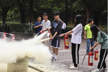 逃生疏散演练在电子楼8B实验区开展。大学生创新实验室的师生共同参与了此次逃生演练。演练案例是某实验室发生事故,冒出浓烟,随即一阵尖锐短促的火灾警报声响起,全体师生根据具体的预设路线有序地进行了撤离,并顺利集合在电智学院大门口。集合完毕后,安全保卫部(武装部)姜因耀等老师向学生详细介绍了消防器材及其使用方法。师生们还学习使用灭火器和消防水管。