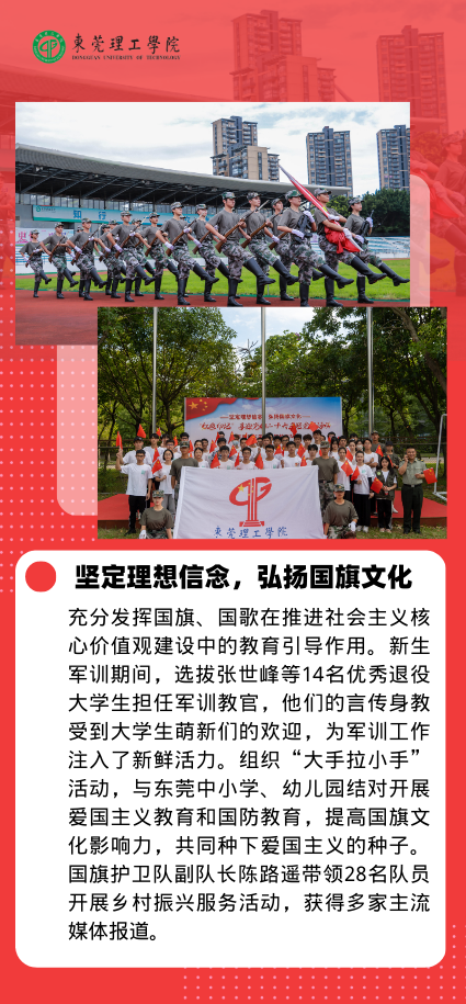 擎旗引领,厚植青年学生家国情怀。以国旗文化为抓手,打造“塑魂”和“塑形”全方位结合的爱国主义教育平台和学习实践平台。每一次升降旗仪式,都是一次深刻的爱国主义教育。升国旗体验活动中,同学们在国旗护卫队队员的指导下学习升国旗仪式的程序、步骤和要领,沉浸式感受升国旗的神圣与庄严。