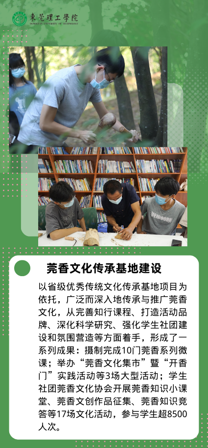 夯实基础,传承中华优秀传统文化。莞香是一种极具东莞代表性的文化资源和精神资源。莞香文化传承项目建设在原有基础上不断深化拓展,夺得第八届中国国际“互联网+”大学生创新创业大赛广东省分赛铜奖;学生社团莞香文化协会开展了莞香知识小课堂、莞香文创作品征集、莞香知识竞答等一系列文化活动,参与学生超过8500人次,大大提升了莞香文化在师生中的吸引力和感染力。